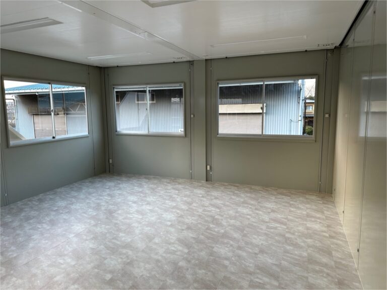 先日、千葉県市原市の会社様よりご依頼をいただき、中古ユニットハウスの搬入・設置工事を行いました。 今回は、限られた敷地を最大限に有効活用できる2階建て仕様となります。簡易的なキッチンを取り付け、そして床の仕上工事として長尺シートも貼りました。